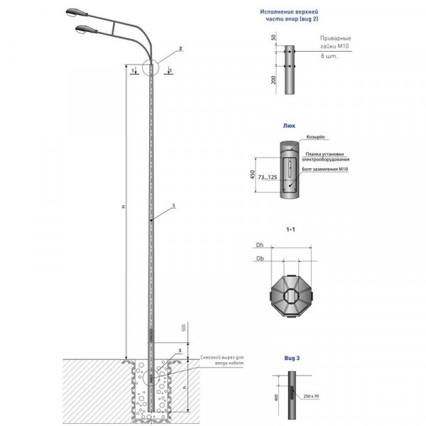 Опора состоит из ствола и подземной части. Изготавливается конструкция из стального проката, который сгибается до получения восьми граней, что придаёт опоре дополнительную прочность и при этом малый вес. Внутри опора полая, что даёт возможность вывести кабельную систему к осветительным приборам.