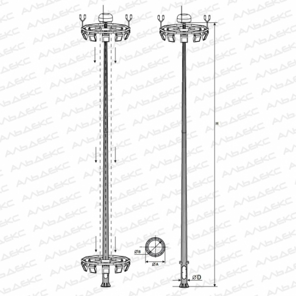 Высокомачтовые опоры освещения, предназначенные для монтажа большого количества светильников (до 12) на высоте, позволяющей увеличить их продуктивность и площадь охвата. Опоры ВМО-35-В исп. 6 заменяют собой сразу несколько стандартных опор освещения, что позволяет полностью окупить их увеличенную стоимость, связанную не только с большой металлоемкостью, но и со сложной организацией конструкций. При этом такие металлоконструкции отличаются оптимальным для своих габаритов весом, не создают излишней нагрузки на грунт, могут быть использованы для подземного подвода кабельной системы, что позволяет отказаться от протягивания дополнительных проводов. Системы используются на стадионах, на промышленных площадках и т.д. Их гармоничный дизайн и современное исполнение, а также возможность обслуживания без привлечения габаритной спецтехники, которой часто требуется специальный подъезд, позволяют использовать их при обустройстве жилых комплексов.